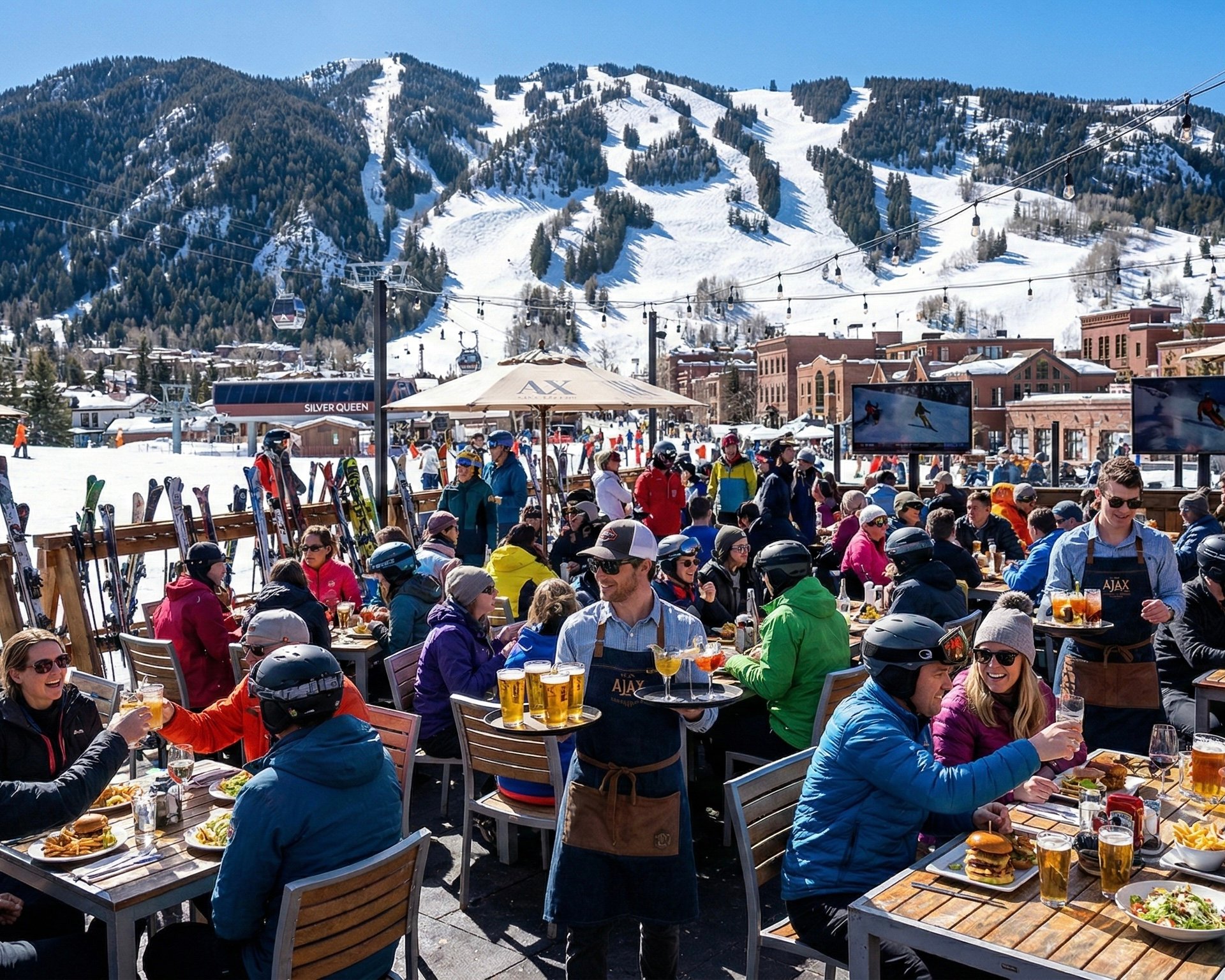 Ajax Tavern becomes the epicenter of afternoon gatherings — truffle fries, rosé, and front-row views of Aspen Mountain.