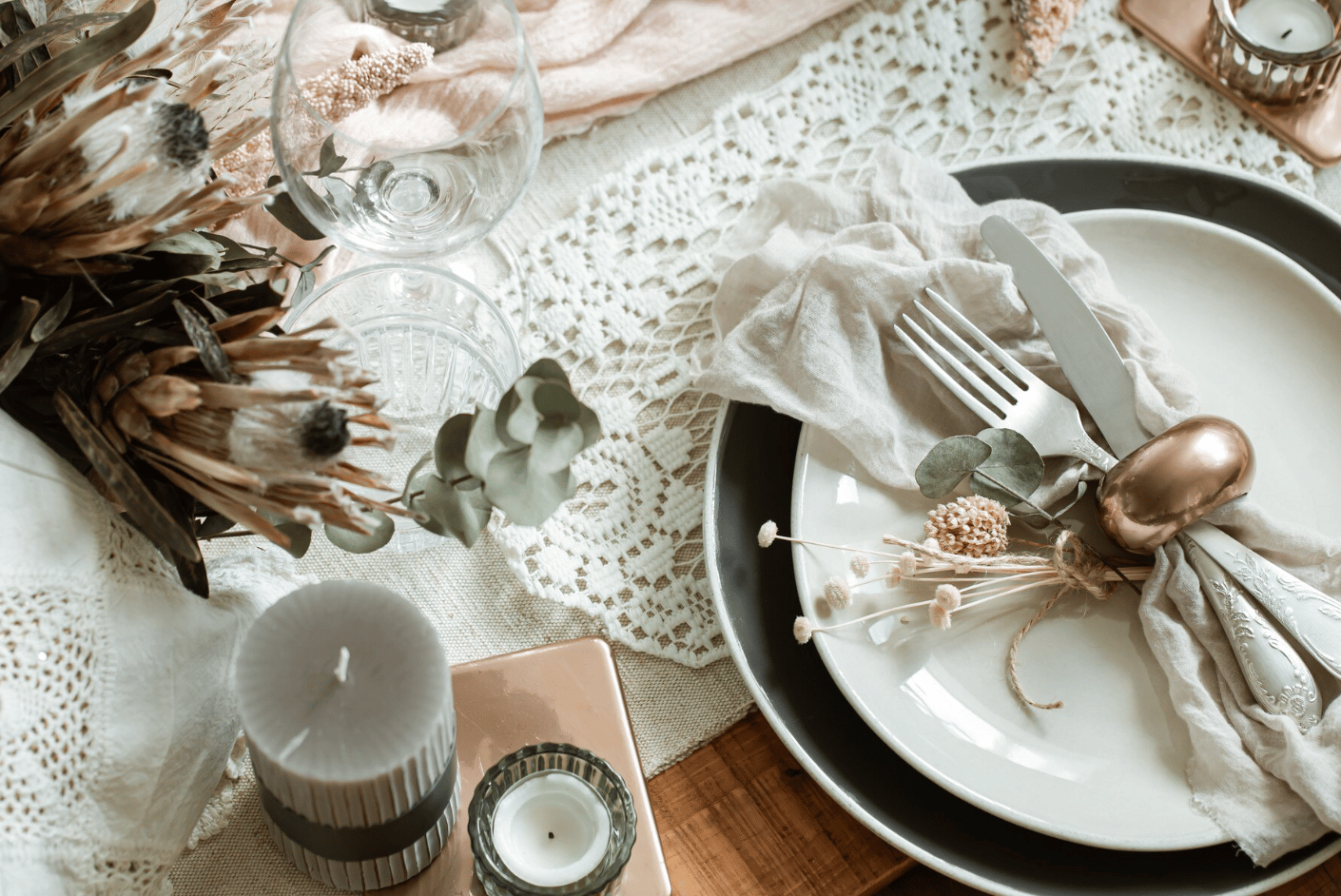 Add touches of nature — small pine sprigs, dried orange slices, or handmade place cards — to personalize each setting. Pair the scene with candles in varying heights and textures for a glowing finish.